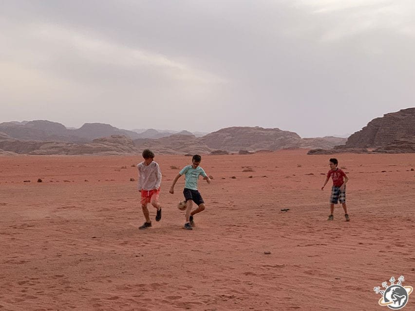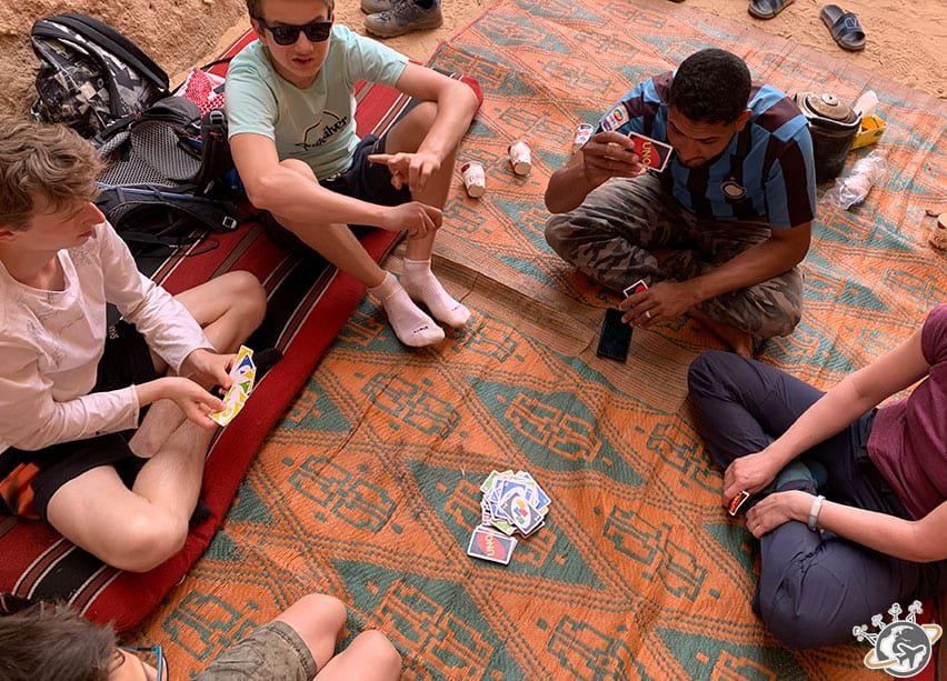 Une partie de Uno à 10 dans le désert du Wadi Rum, en français et en arabe, en voilà un joli souvenir !
