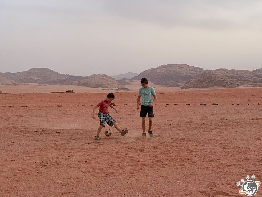 En plus, après le dîner, les garçons ont fait leur première partie de foot sur un terrain de gazon synthétique tout à fait approprié. Est-ce que mes enfants partent en vacances avec ballon ? Oui absolument. Avec une pompe pour le regonfler au besoin. De mon côté, j’ai rejoins Alexane, ses parents et Mazen pour un thé à la menthe autour du feu.