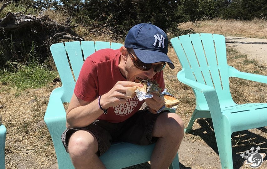 Avant de nous installer il faut déjeuner. Nous nous arrêtons au hasard chez Steamer Lane Supply. Bowl végé pour moi, quesadillas et sandwichs pour Népoux et les Nains. C’était frais et très bon (et il y avait plein de Français en même temps que nous).