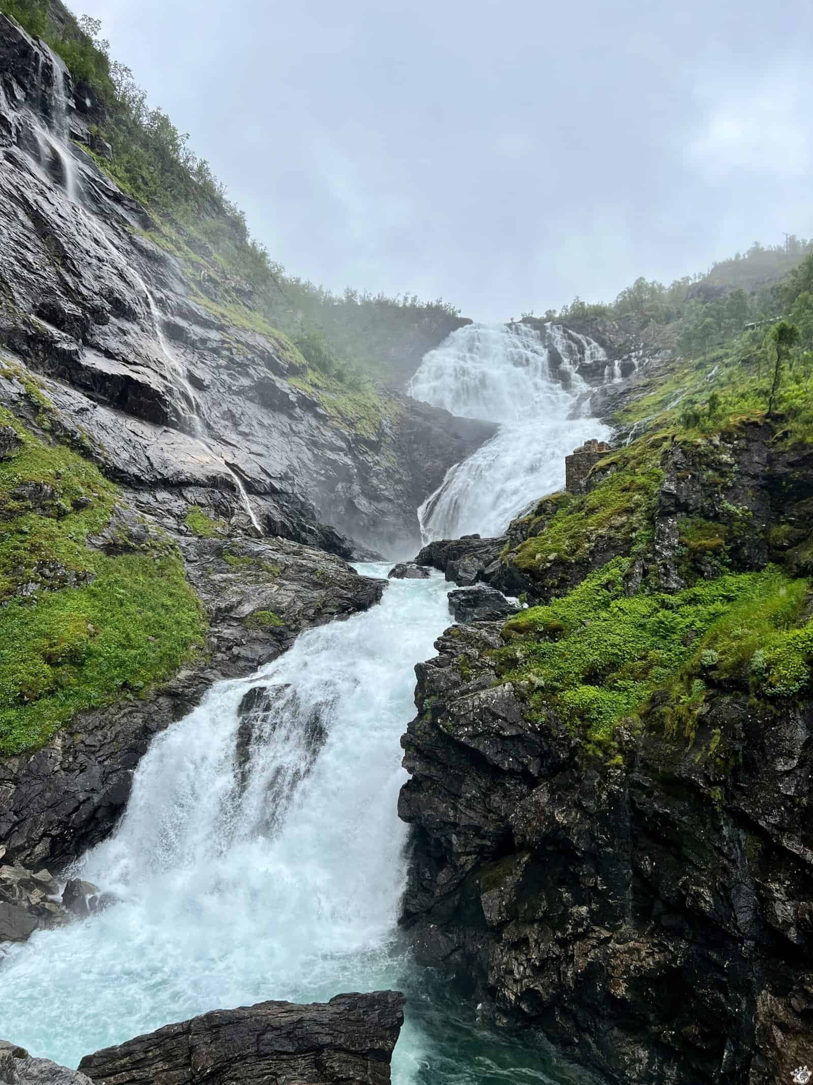 Au milieu du parcours, les passagers sont invités à descendre quelques minutes pour admirer la cascade de Kjos qui chute de 93 m. Alors que la pluie n’invite pas du tout à la contemplation, une musique retentit. Tout le monde cherche d’où ça vient… puis on voit apparaitre une femme qui commence à chanter et à danser.
