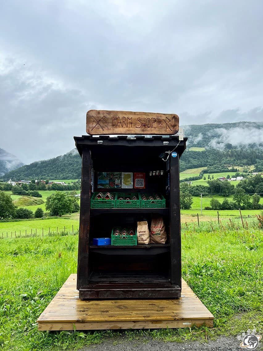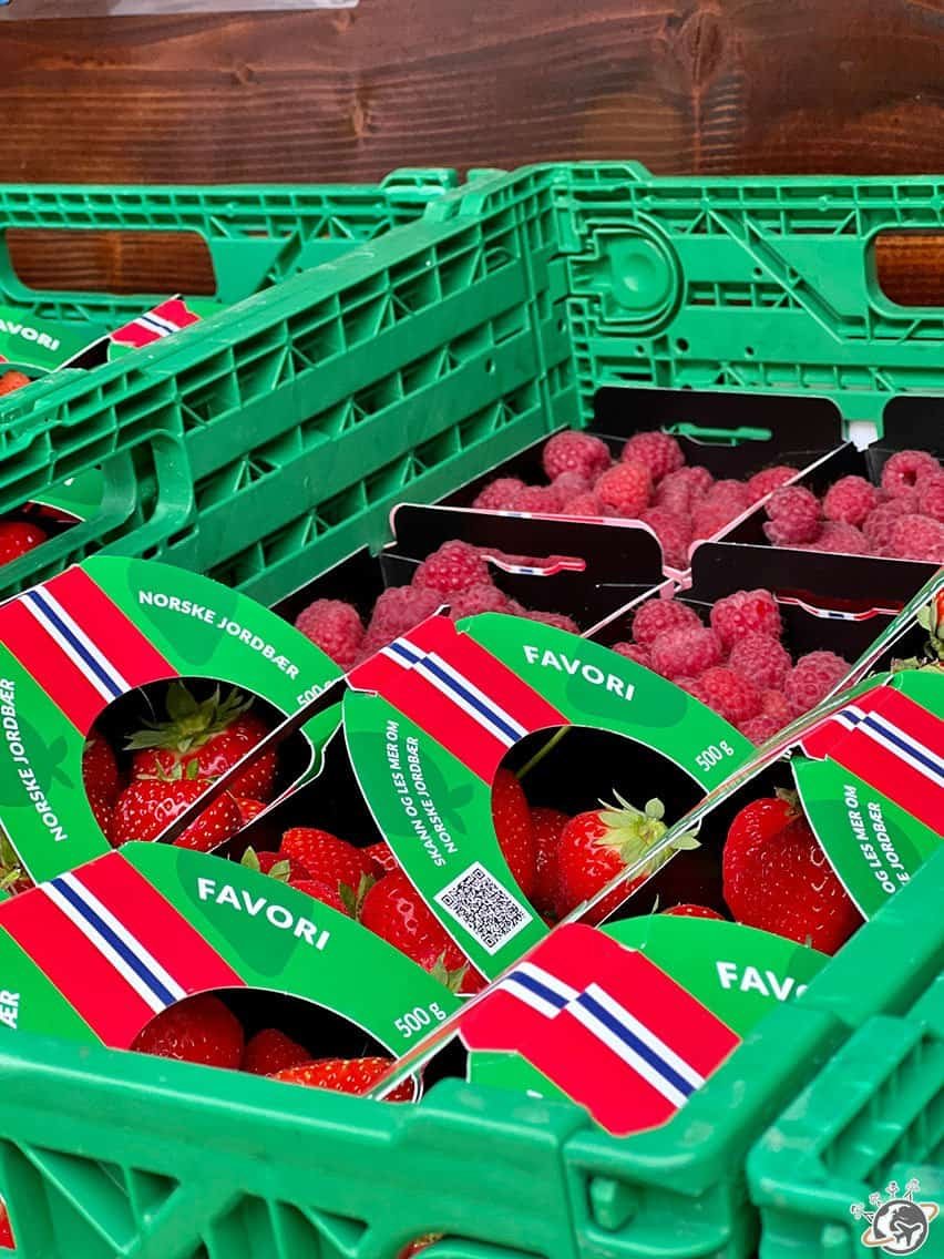 La production de framboises de Vik est l’une des principales du pays. Nous avons pu les goûter, il y avait des barquettes à vendre dans une ferme de poche juste à côté de l’église de Hopperstad. C’est malin, car tous les touristes passent forcément devant. On avait le choix entre des fraises ou des framboises pour 6 euros la barquette. Aucun vendeur, uniquement une « caisse » dans laquelle il fallait déposer l’argent. Nous nous sommes régalés.