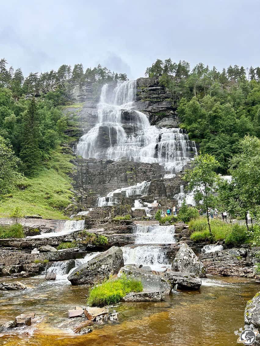 Après une bonne heure de bus, et quelques jolis lacs, nous arrivons à la fameuse cascade de Tvindefossen. Impressionnante avec sa hauteur de près de 110 mètres, elle est alimentée par la fonte des glaciers et les rivières de montagnes environnantes, ce qui lui donne un débit puissant, surtout quand la neige fond à son tour au printemps.
