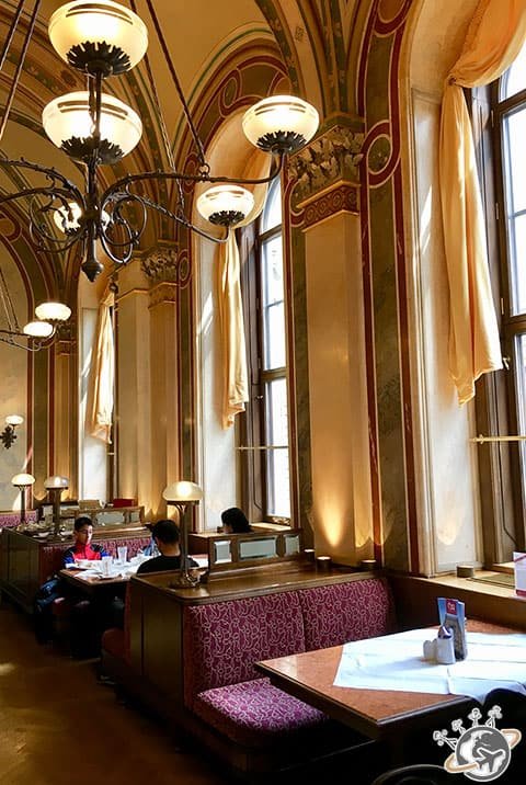 Pas besoin de réserver, même si la queue peut être dissuasive. Pas de stress, ça va vite. Le Café est situé à l’intérieur du Palais Ferstel, un somptueux manoir inspiré de l’architecture vénitienne. Ce qu’on remarque en premier, c’est le plafond, incroyable, ou les gâteaux exposés à l’entrée. Ou les 2.