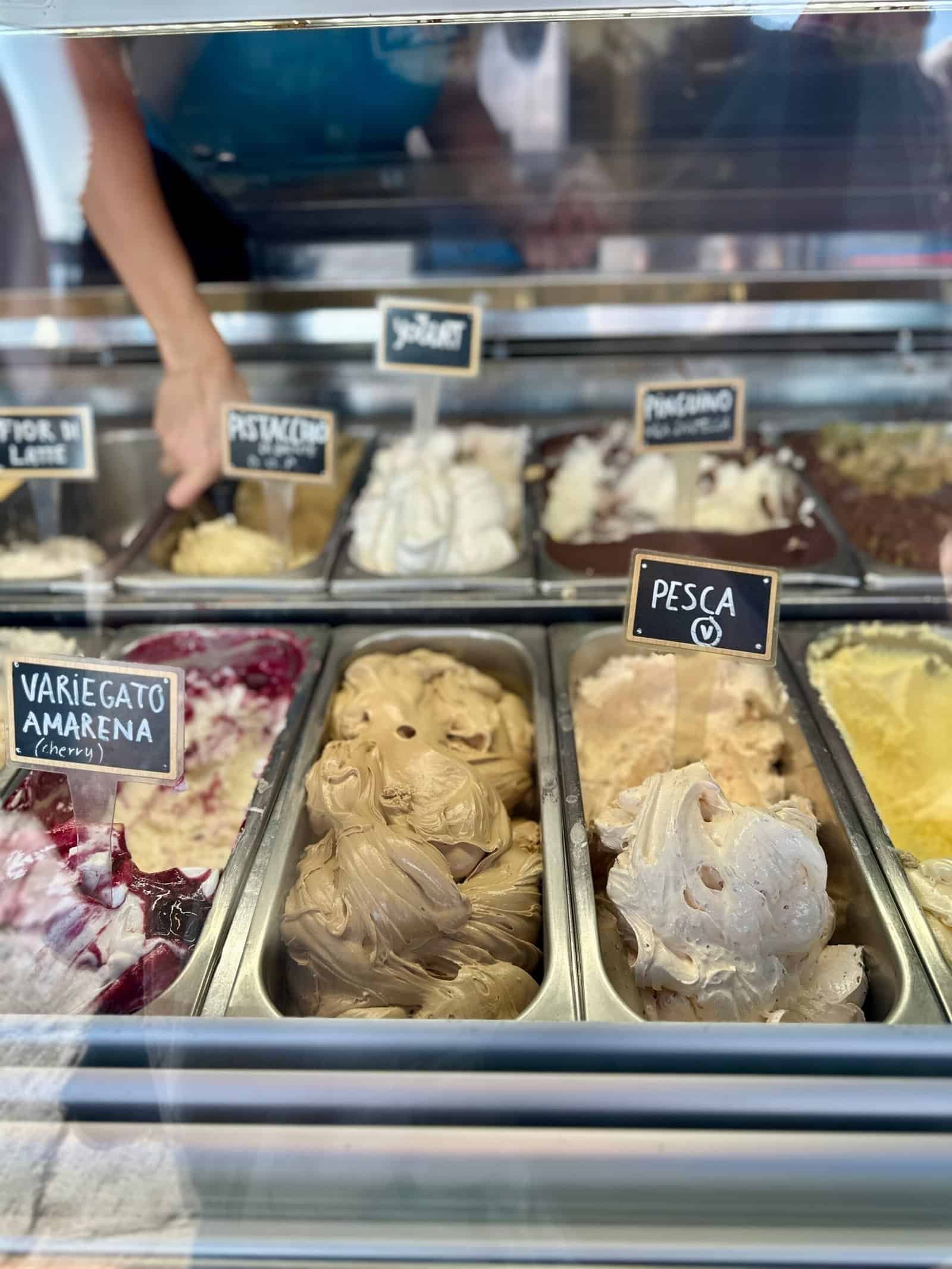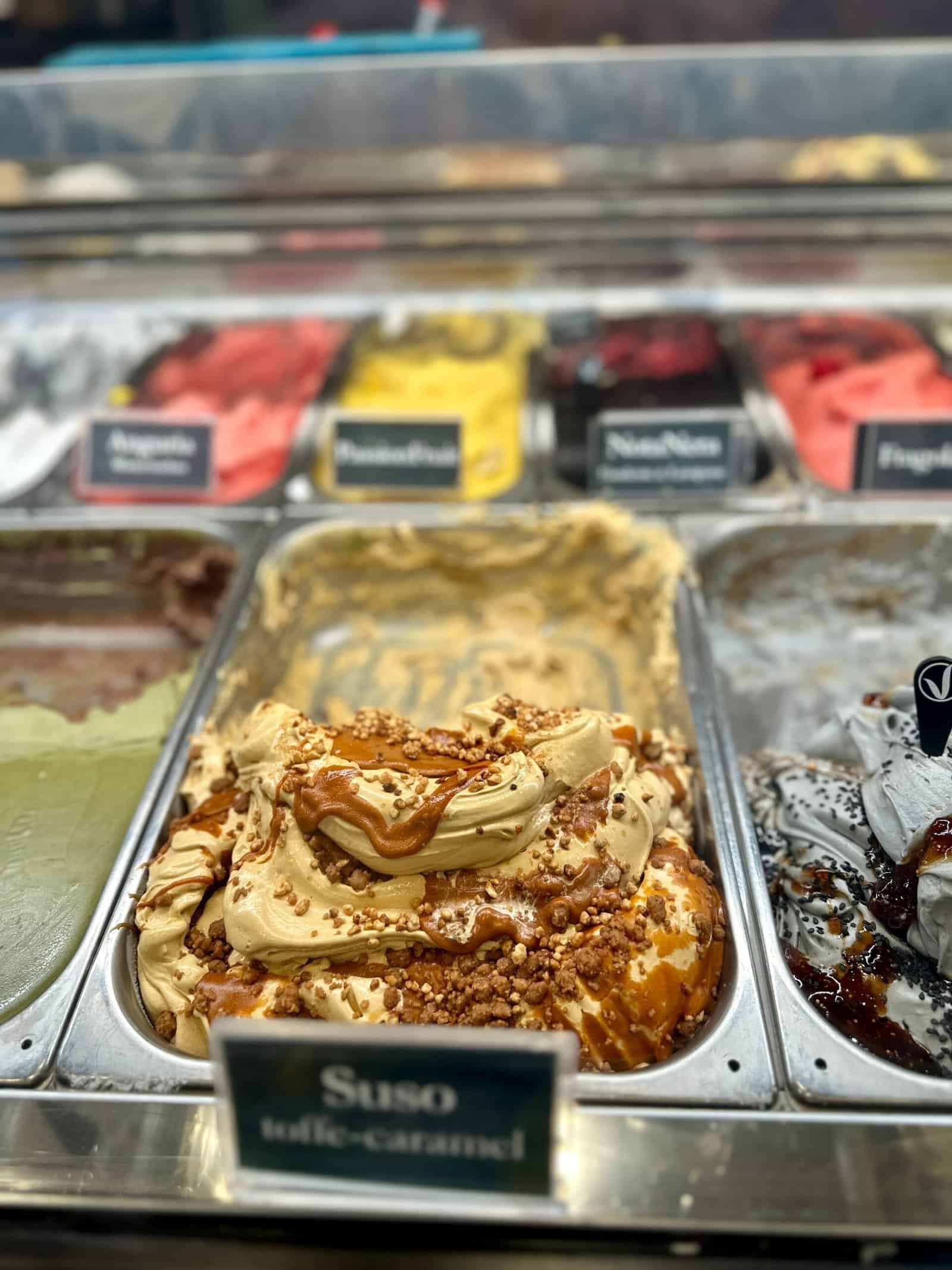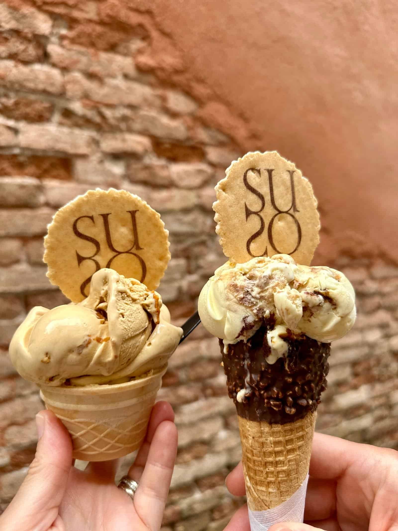 Dernière pause gourmande chez Suso, souvent cité parmi les meilleurs glaciers de Venise. Il y a la queue, ce qui prouve qu’on a tous les mêmes sources. En entrant, on découvre des parfums originaux et des textures qui semblent bien crémeuses. On n’a pas été déçus, c’était vraiment savoureux, et ça se mange sans faim (qu’on avait perdue depuis longtemps, au profit de la gourmandise et des « on est là que 3 jours, alors il fuat en profiter »).