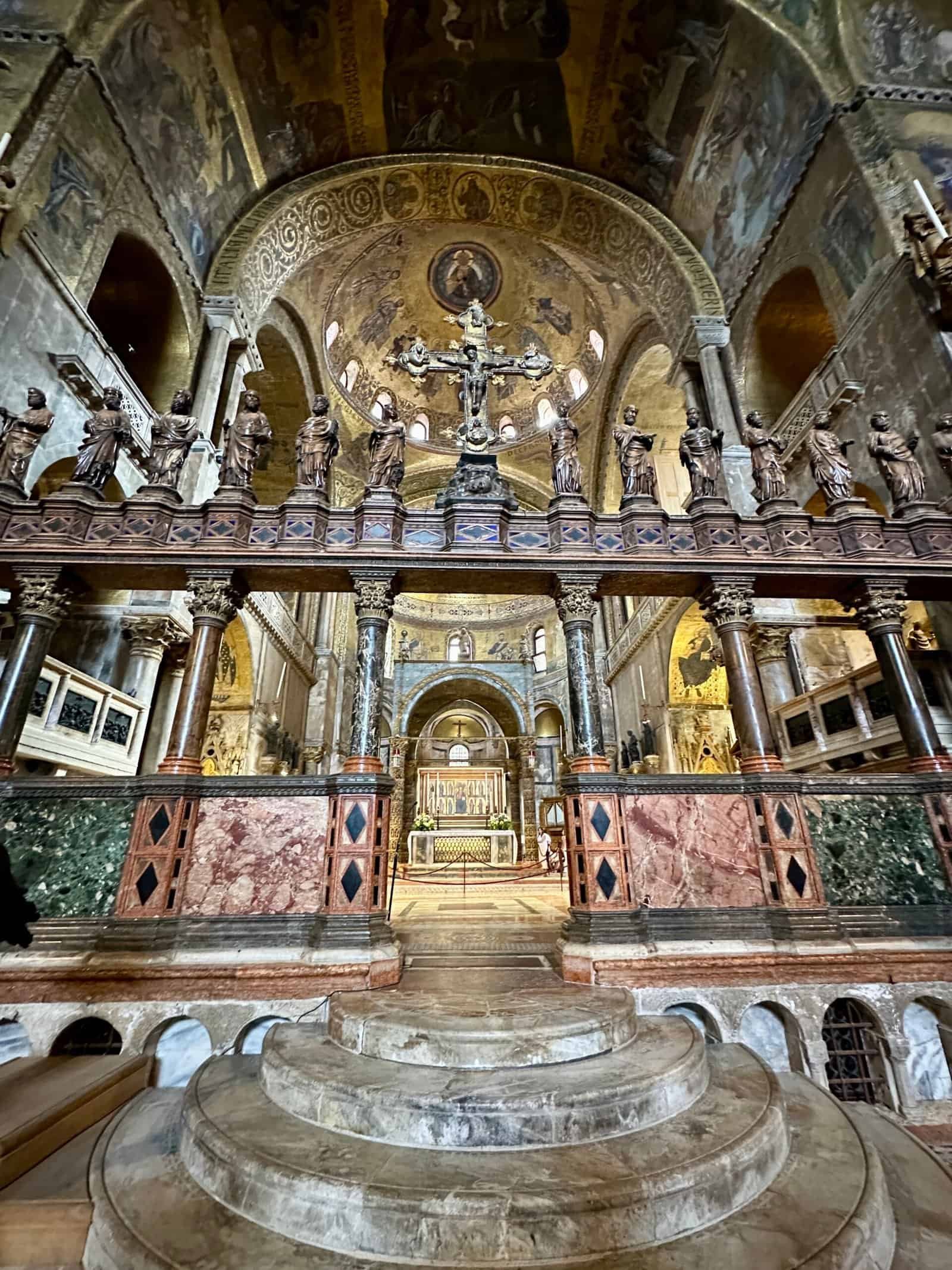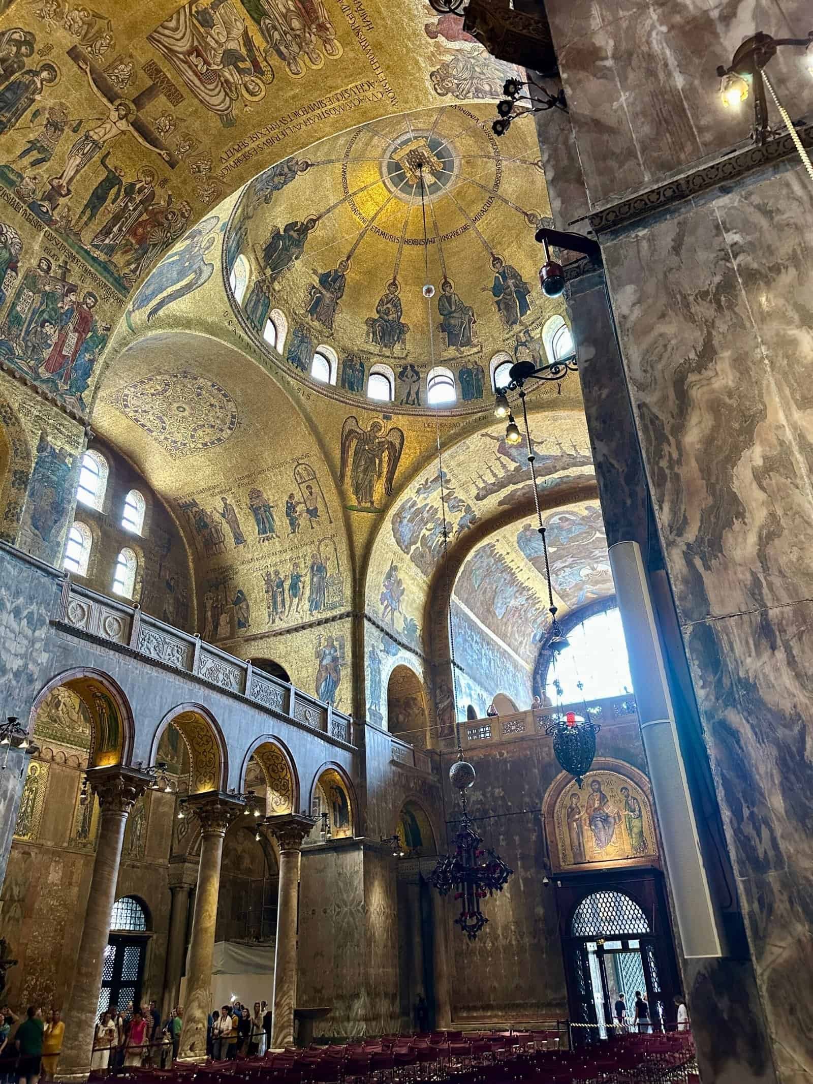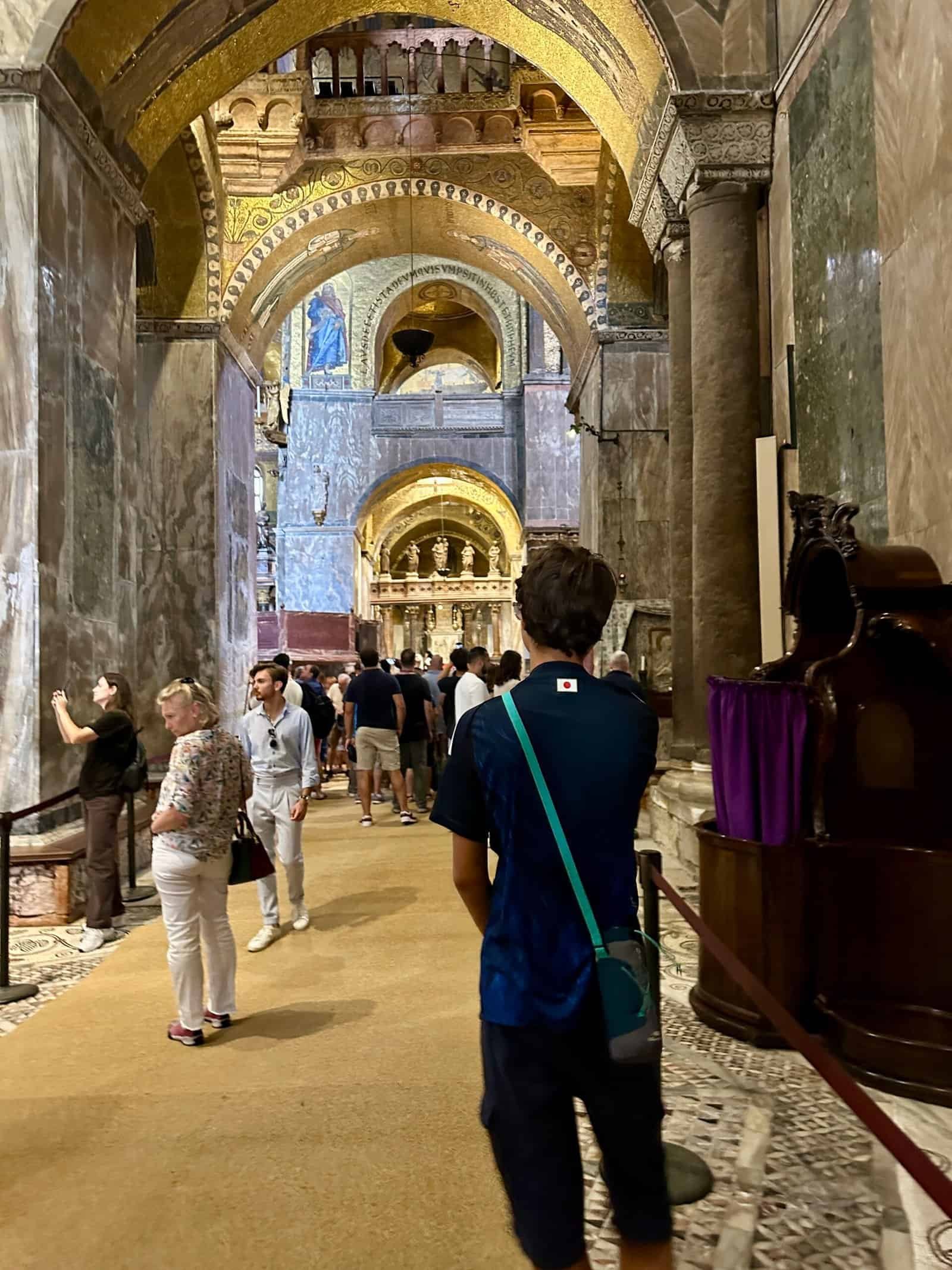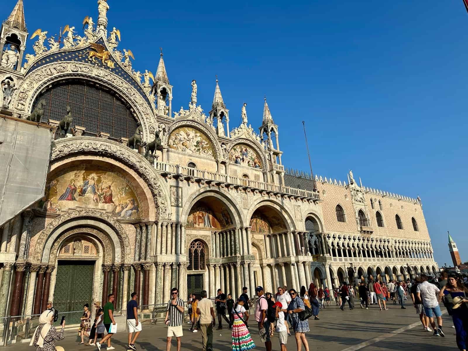 Puis direction la place Saint Marc, nettement moins déserte à 11 h ! Entrer dans la basilique, c’est découvrir un mélange étonnant d’influences orientales et occidentales. L’architecture byzantine domine, avec ses coupoles, ses arches et ses mosaïques dorées qui captent la lumière. Les marbres rapportés des croisades, les reliques, les décors foisonnants donnent au lieu une atmosphère dense, presque hors du temps, très différente de l’agitation de la place juste à l’extérieur.