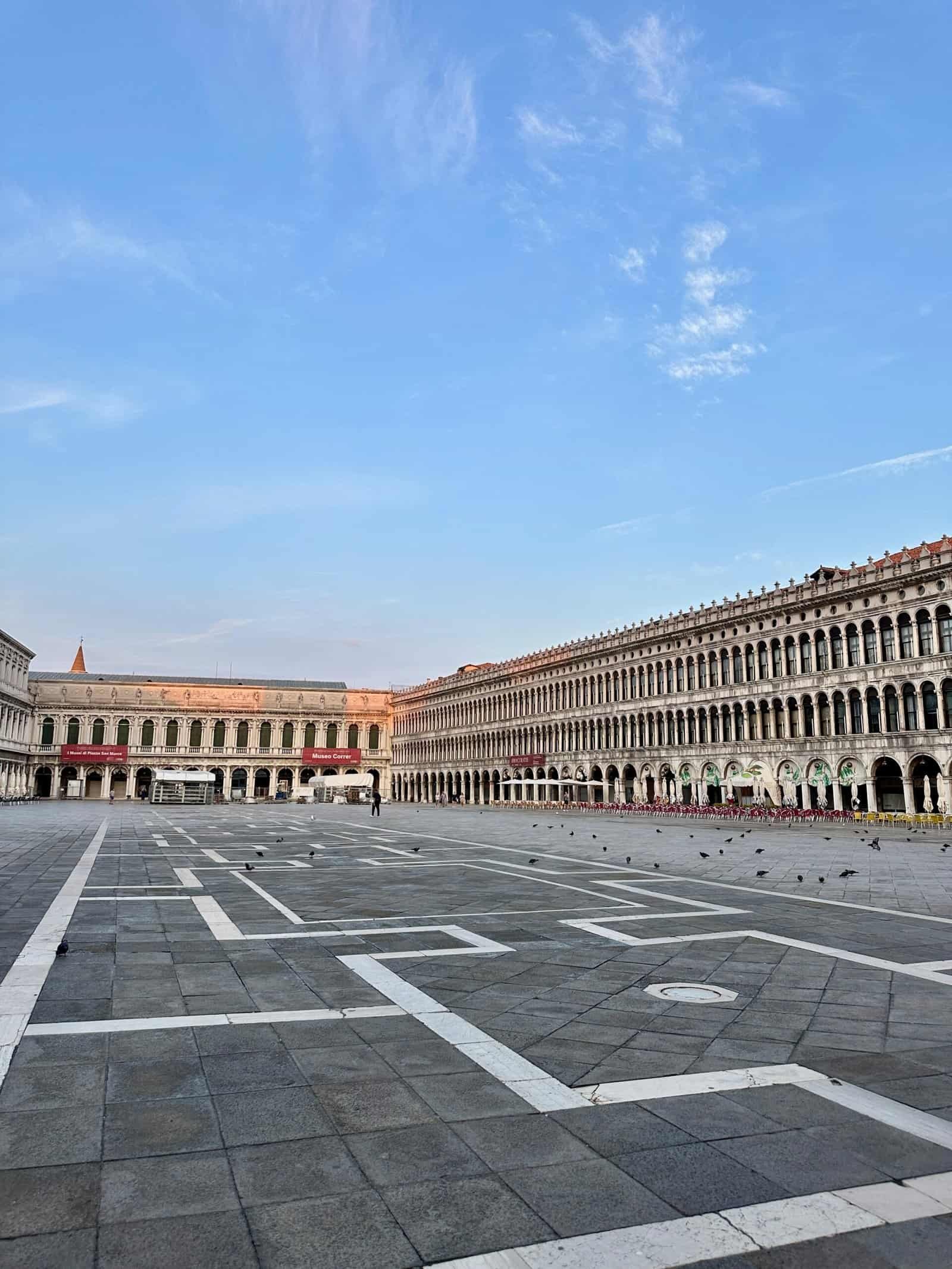 Réveil à 6 h. L’ado avait dit “peut-être”… et n’a finalement rien entendu quand nous sommes partis. Direction la place Saint-Marc à 6 h 26. Quelques personnes, les balayeurs, aucun marchand, et une lumière magnifique.