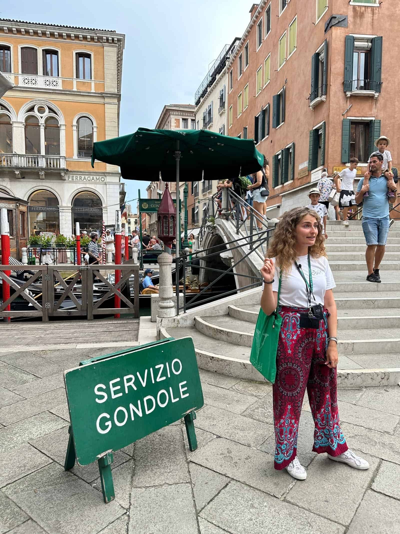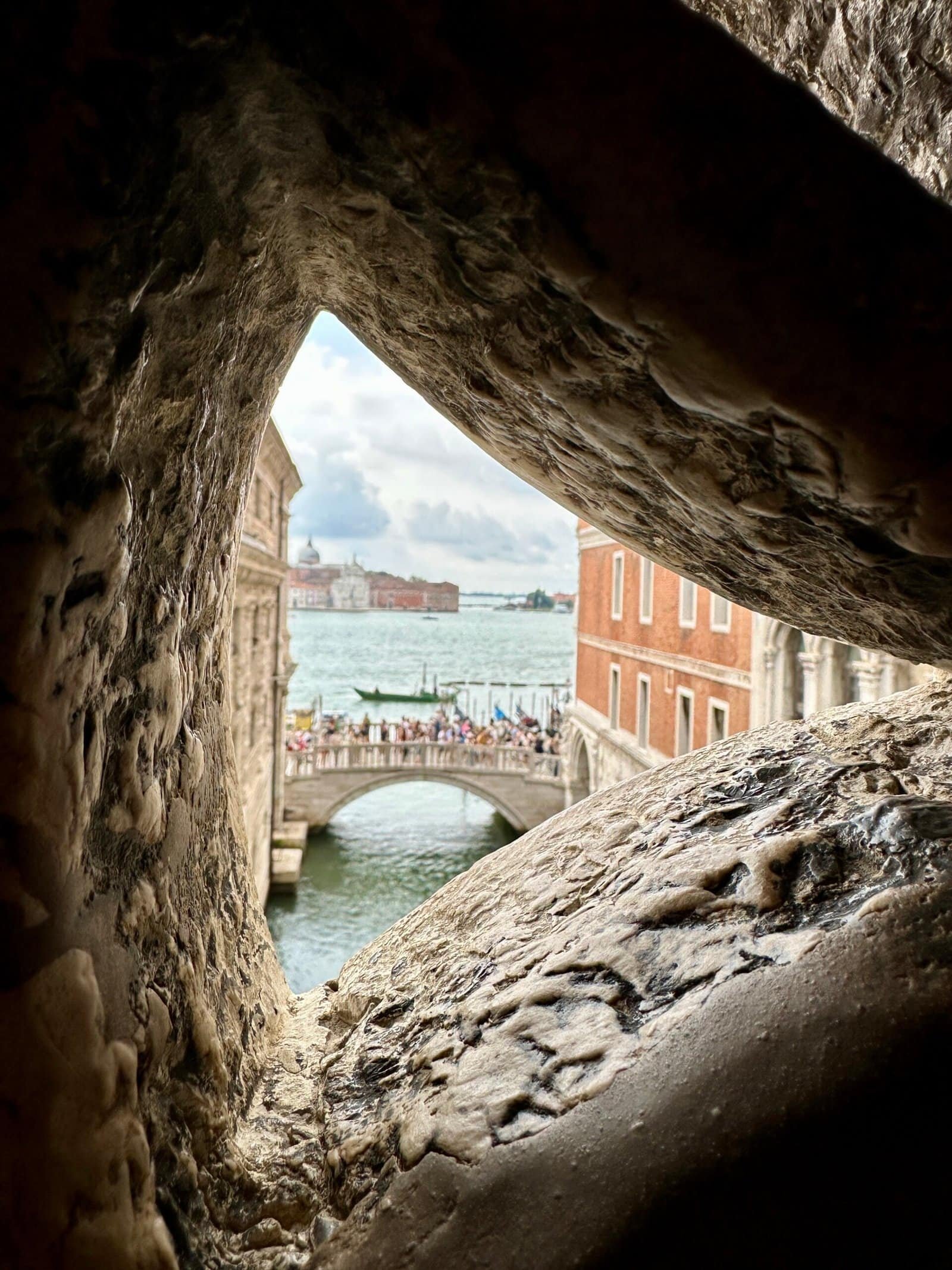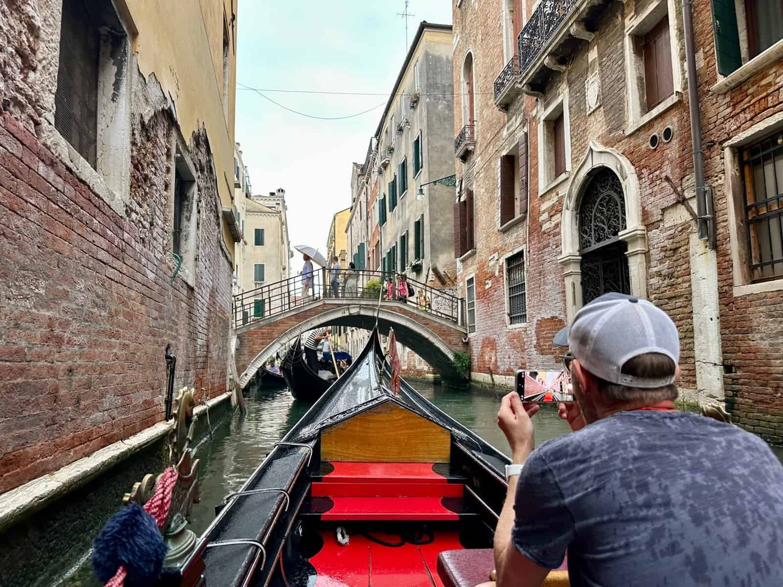 Nous avons embarqué après une marche d’une quinzaine de minutes avec une guide qui nous a expliqué l’histoire des gondoles — présentes à Venise depuis le XIᵉ siècle, au nombre de 10 000 à leur apogée et environ 400 aujourd’hui. La pluie s’est invitée dès le début, ce qui a sans doute aider à ne finalement pas partager notre gondole. On glisse dans les petits canaux, puis sur une portion du Grand Canal. C’était court, mais largement suffisant pour profiter sans finir totalement trempés.